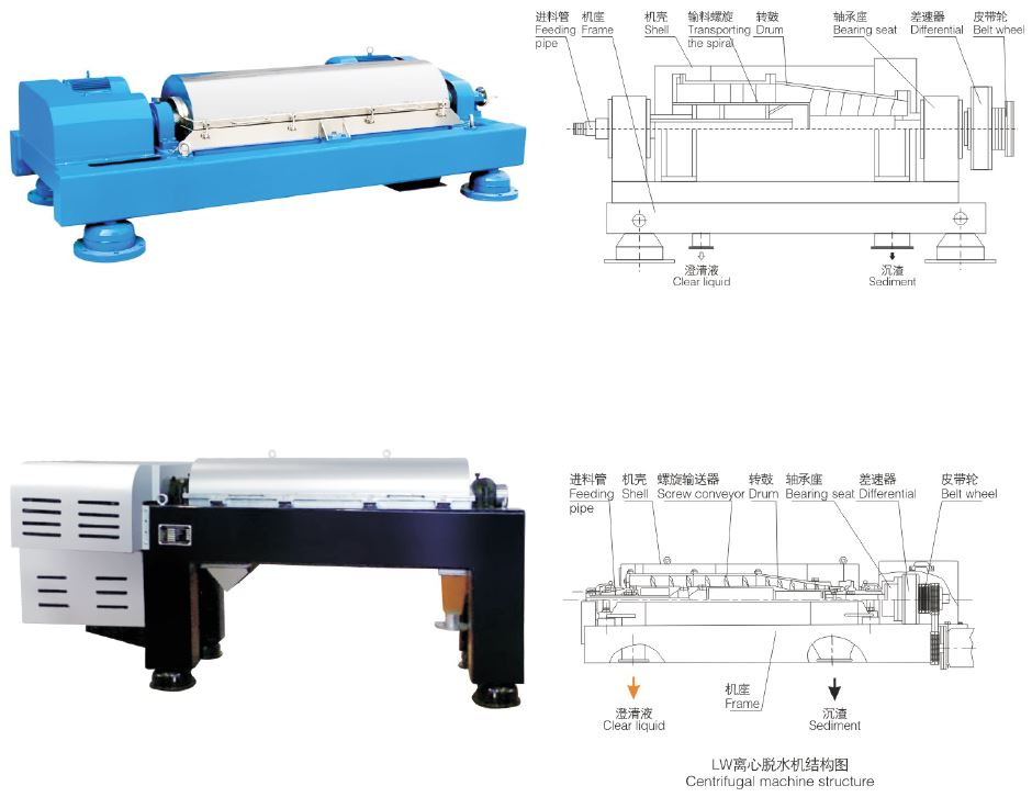 LW型离心机是一种卧式螺旋卸料、连续操作的沉降设备。转鼓与螺旋不定转差高速运转,物料由进料管连续进入螺旋推料器内,加速后进入转鼓,在离心力场作用下,较重的固相物沉积在转鼓壁上。由螺旋推料器将沉积的固相物料连续不断地推至转鼓锥端,经排渣口排出机外,较轻的液相物体由转鼓大端溢流口连续溢出转鼓,经排液口排出机外。本机定在全速运转下,连续进料、分离、卸料。具有结构紧凑、连续操作、运转平稳、适应性强、生产能力大、维修方便等特点。适合分离含固相物粒度大于0.005mm、浓度范围在2-40%的悬浮液。广泛用于化工、轻工、制药、食品、环保等行业。