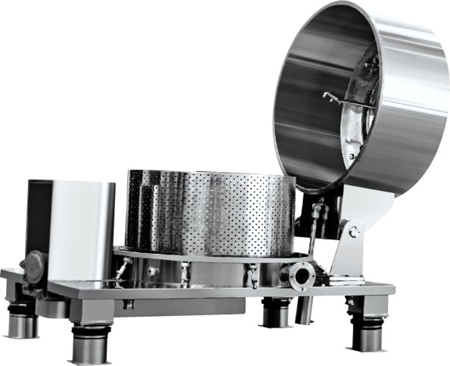 4、翻盖上设置进料管、洗涤管、观察镜、照明孔。配置在线清洗系统(选 装),对离心机外壳内壁、专鼓内外表面、集液槽表面等离心机内部进行在线清洗,保证了洁净度要求,符合GMP规范。